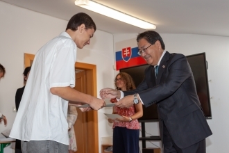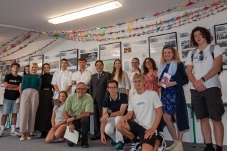 9月20日、川上大使は、ピエシュチャニ市のピエール・デ・クーベルテン高校を訪問し、「ヒロシマ・ナガサキ原爆写真ポスター展」を活用した、学生たちによる原爆に関する学習発表会に出席しました。同校の学生たちは4月から、広島および長崎に投下された原爆に関する学習に取り組んでおり、今回の発表会には学生の家族等も出席するなど、多くの方に原爆投下について知っていただく機会となりました。また学生たちには、広島平和記念資料館の石田館長、同校のウルバン校長および川上大使連名の、修了証が授与されました。原爆投下から80年を迎えた今年、スロバキアの学生たちが原爆について積極的に学ばれたことを嬉しく思います。